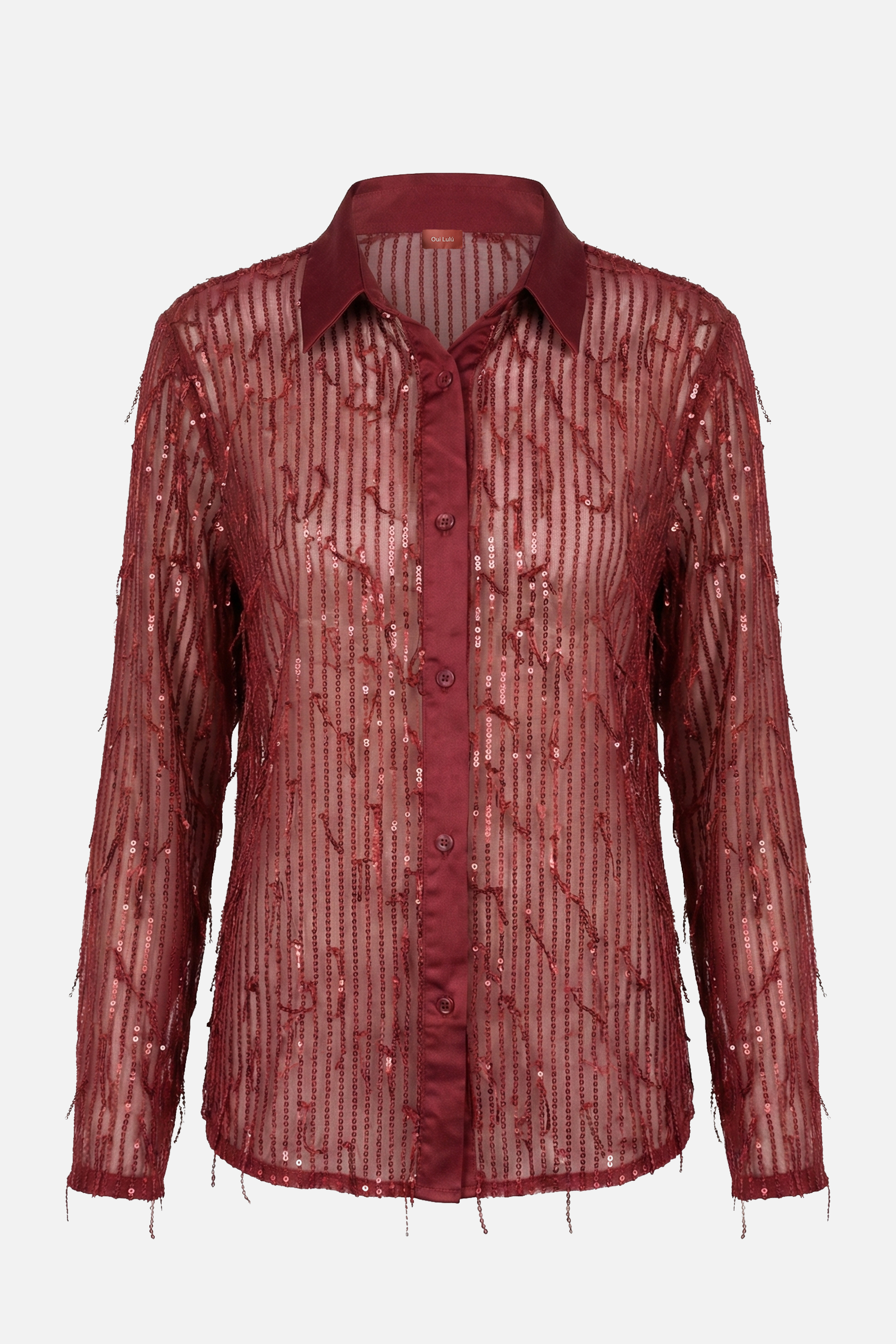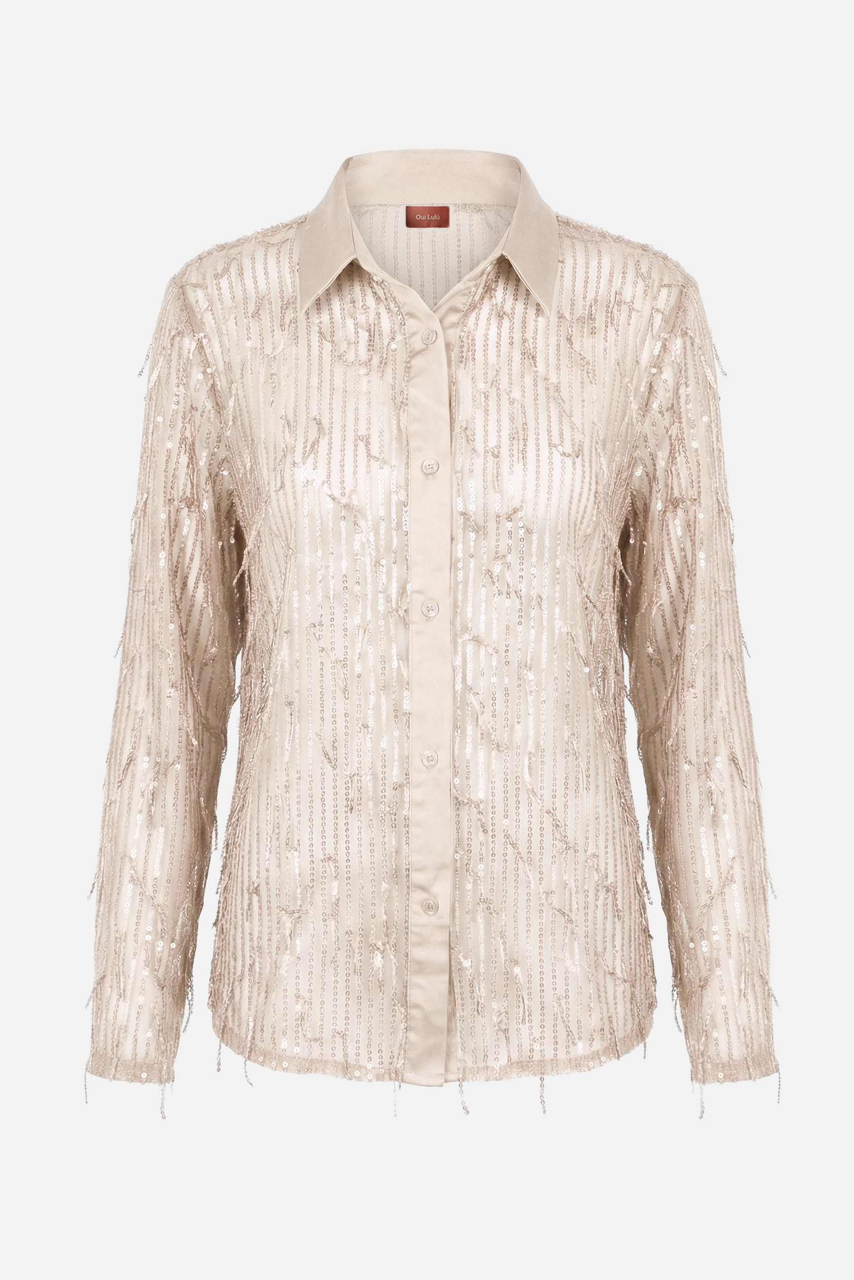 La camicia DOMINIQUE è realizzata in tessuto semitrasparente e arricchita da fili luminosi di micro paillettes. Il modello presenta colletto classico, chiusura frontale con bottoni e maniche lunghe, per una silhouette femminile ed elegante. La texture leggera e scintillante dona movimento e luce al capo, rendendolo ideale per look serali o per valorizzare outfit più essenziali. Perfetta indossata da sola o sopra un top minimal per un effetto chic e raffinato.