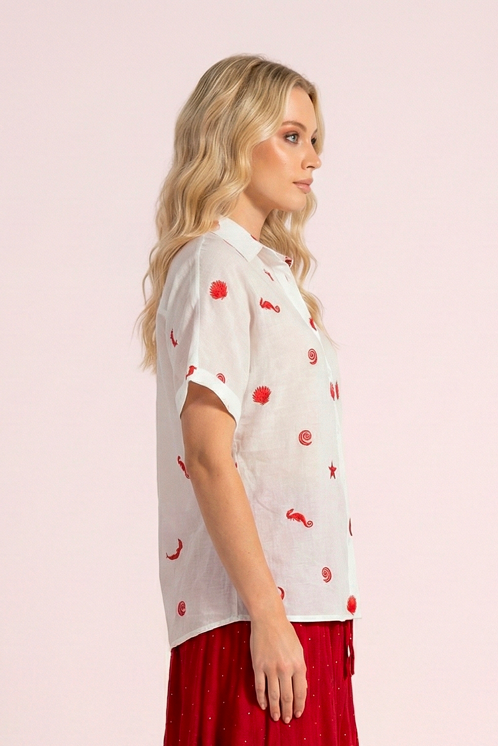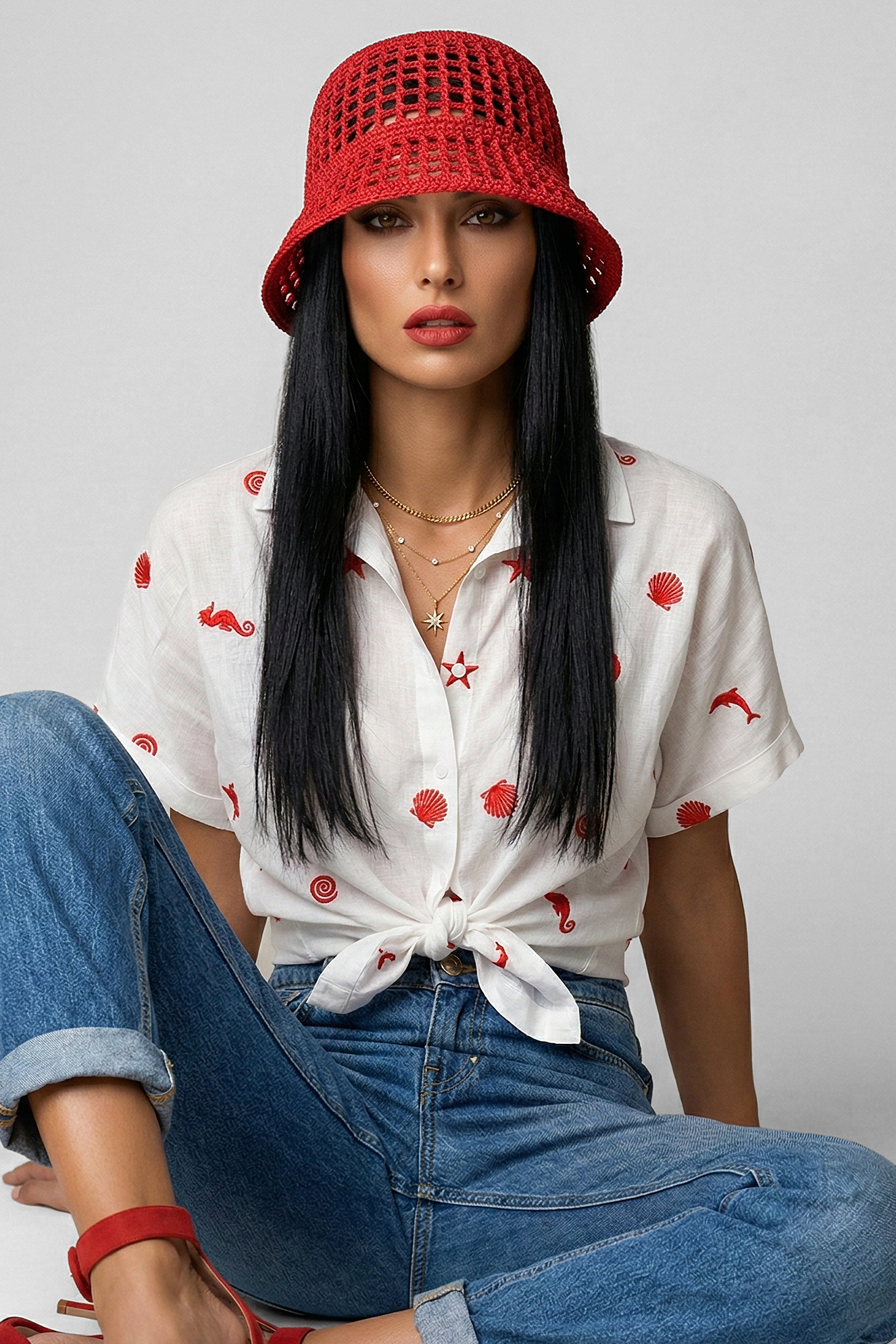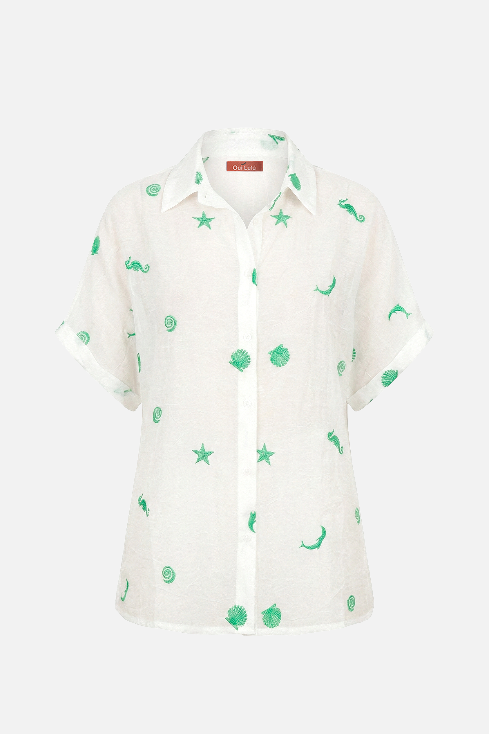 La camicia leggera LAURENCE è realizzata in tessuto semi-trasparente e arioso che accarezza la silhouette con naturalezza. Il fondo chiaro è arricchito da una delicata fantasia ispirata a elementi naturali, per un tocco fresco e raffinato. Colletto classico, abbottonatura frontale e maniche corte con risvolto completano il design essenziale ma ricercato.