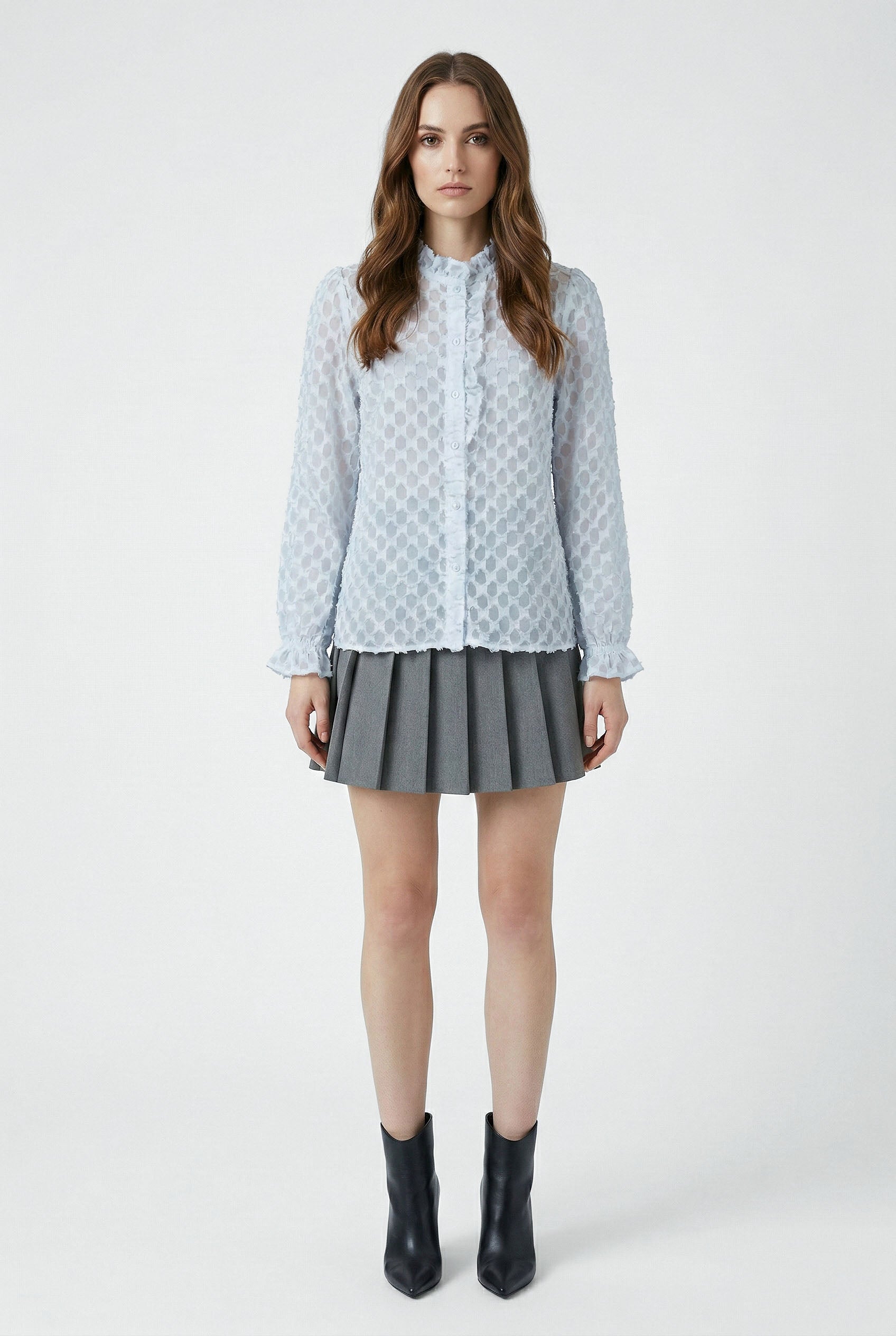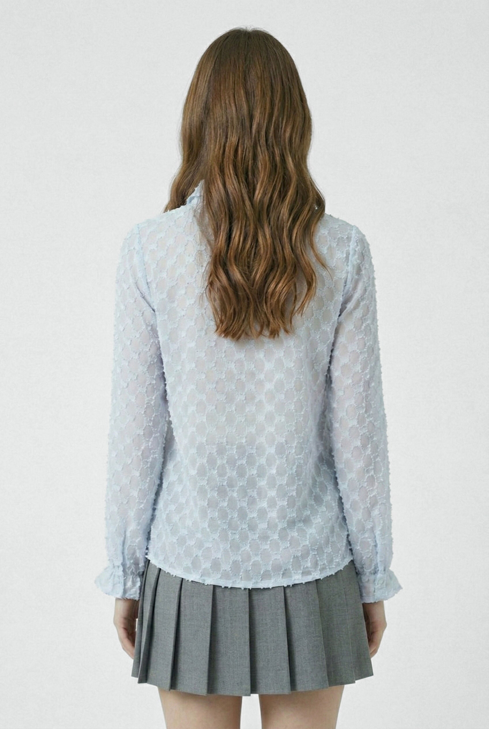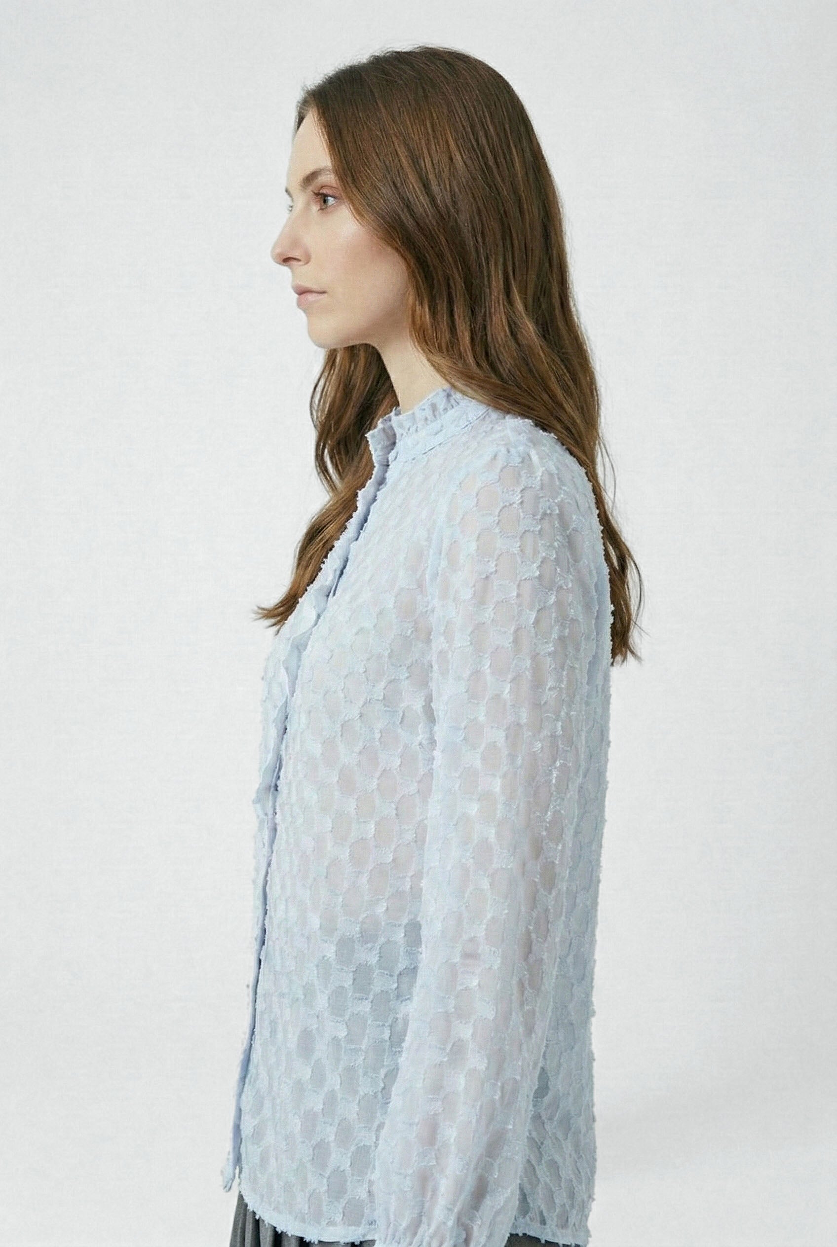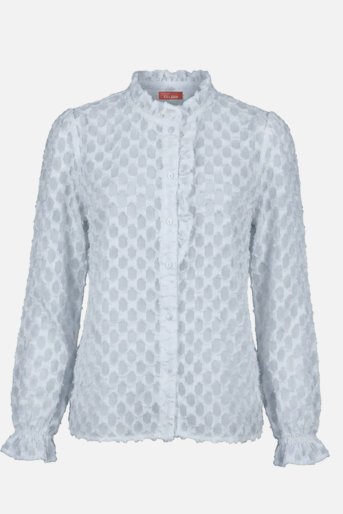 La camicia ODETTE è raffinata e dal design delicato ed è realizzata in tessuto leggero con lavorazione a rilievo che crea un elegante effetto texture. Le maniche lunghe terminano con polsini leggermente arricciati, aggiungendo movimento e leggerezza. Perfetta da indossare con denim o pantaloni sartoriali, è un capo versatile che illumina il look con sobria eleganza.