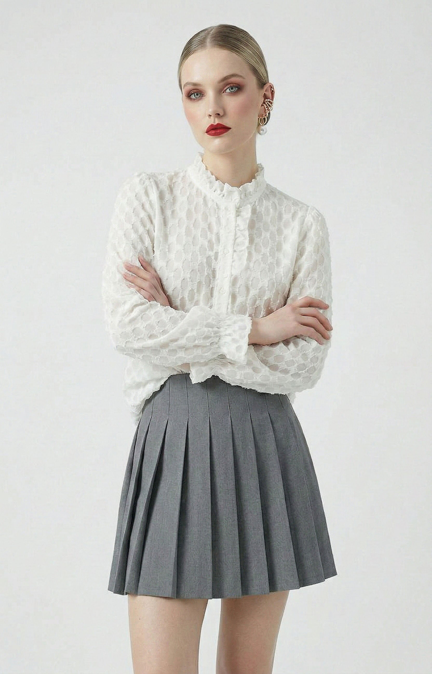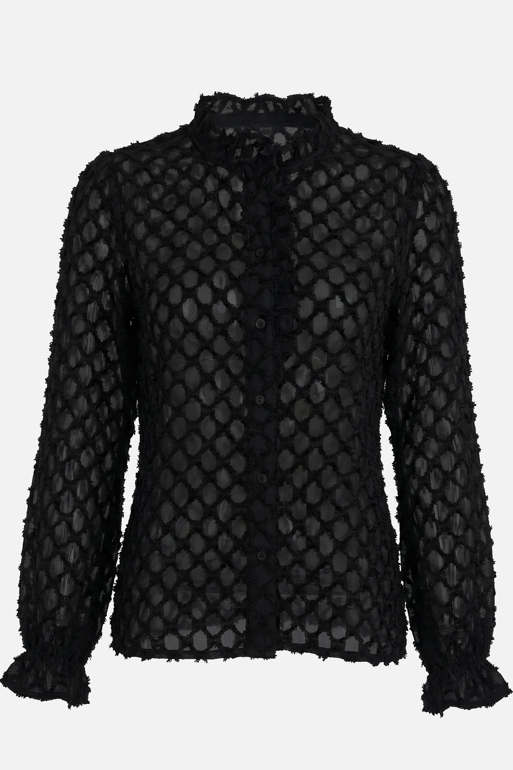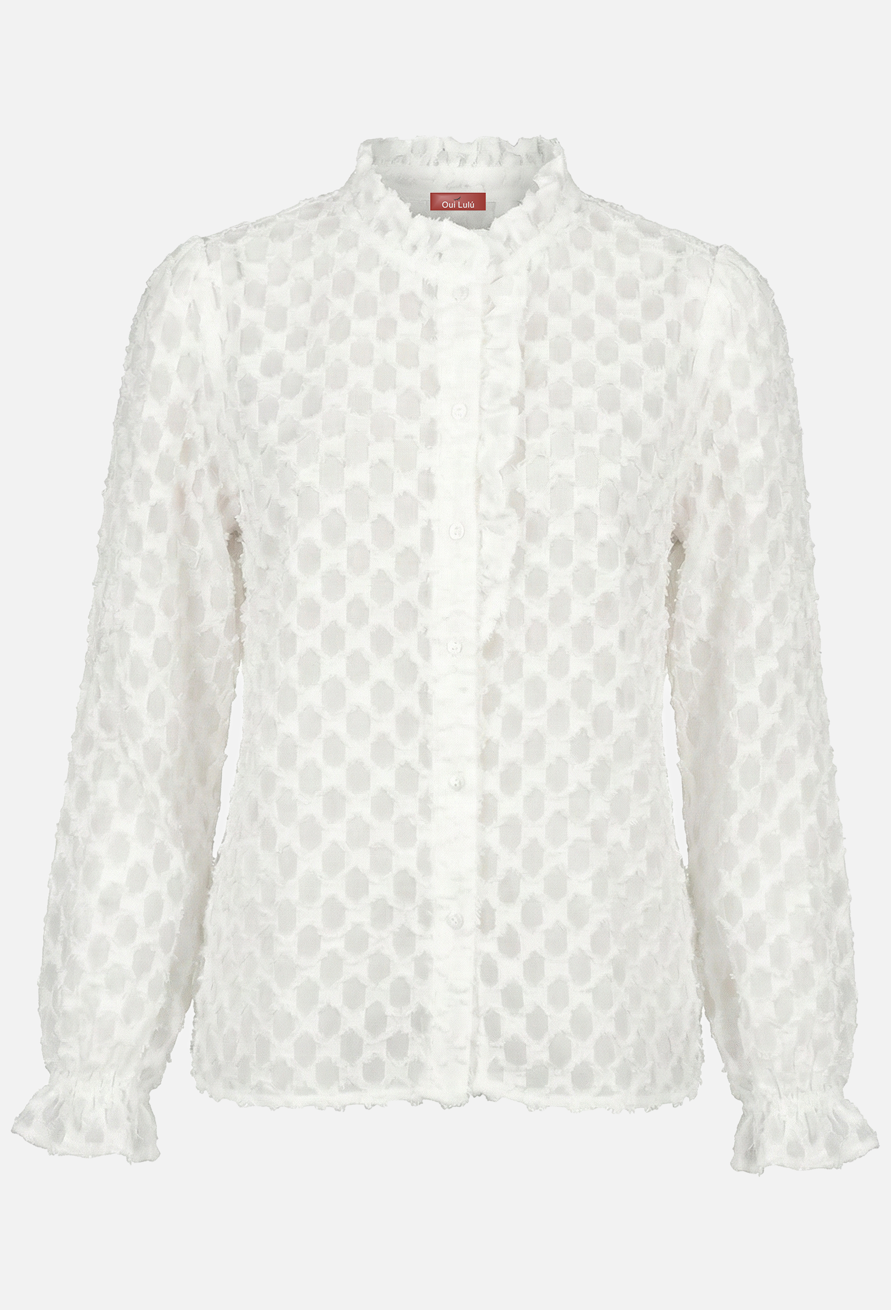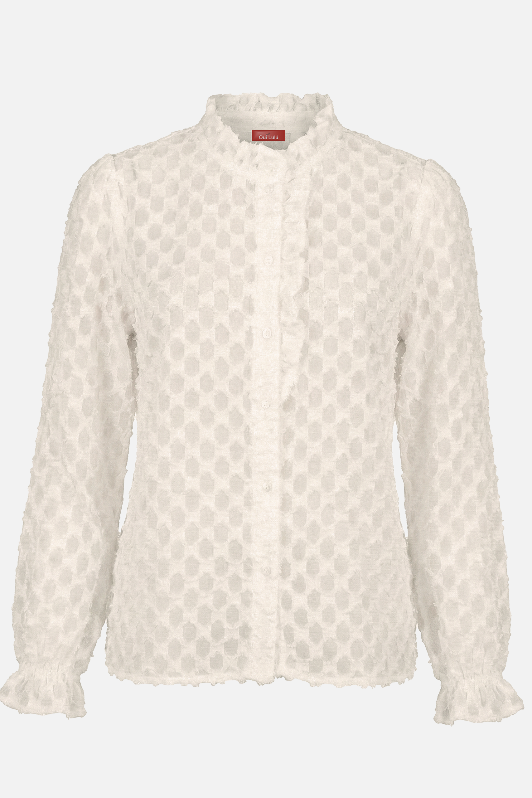 La camicia ODETTE è raffinata e dal design delicato ed è realizzata in tessuto leggero con lavorazione a rilievo che crea un elegante effetto texture. Le maniche lunghe terminano con polsini leggermente arricciati, aggiungendo movimento e leggerezza. Perfetta da indossare con denim o pantaloni sartoriali, è un capo versatile che illumina il look con sobria eleganza.