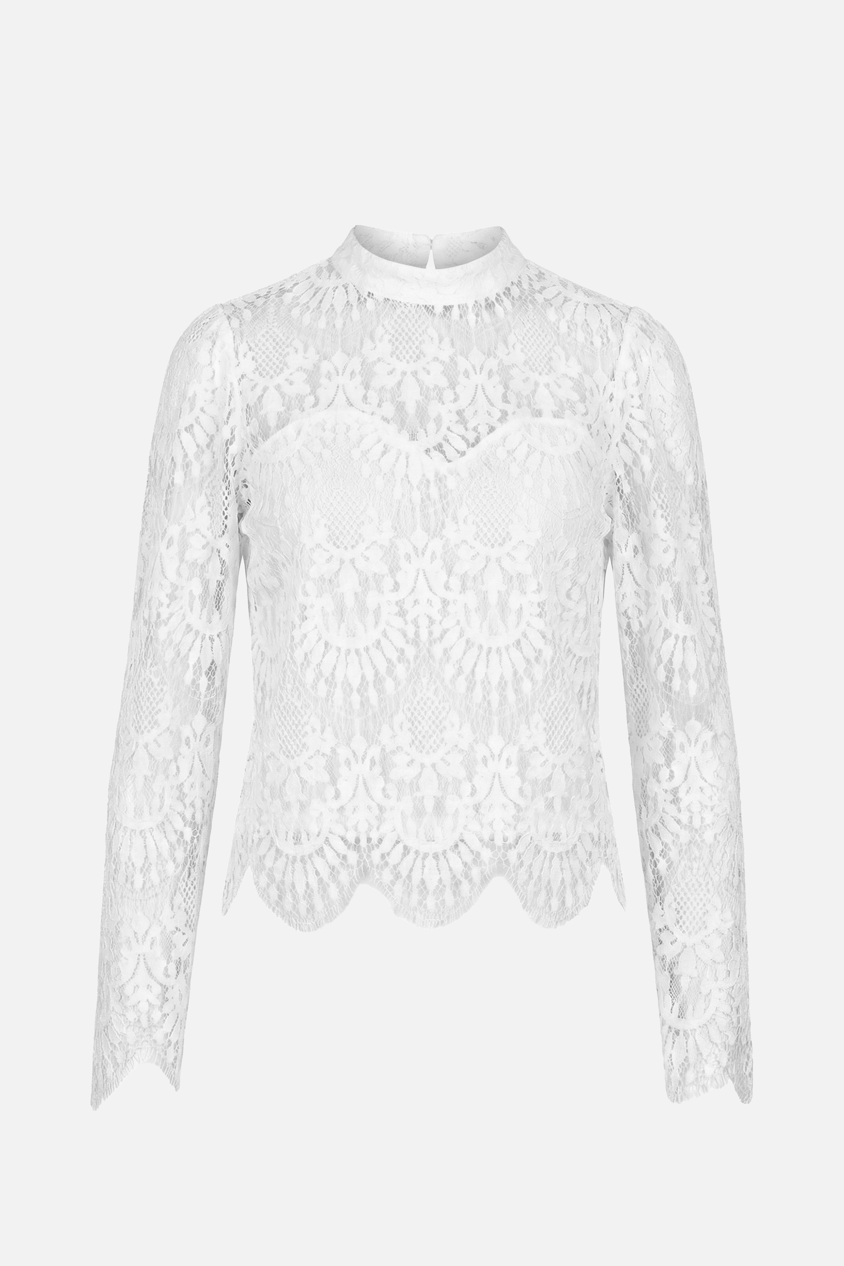 La blusa FLEUR è elegante e senza tempo e il pizzo bianco dona un tocco di femminilità a ogni outfit. Realizzato in delicato pizzo floreale, è rifinito da preziosi bordi smerlati su fondo e polsini per un effetto romantico. Il tessuto leggero unisce comfort e raffinatezza, rendendolo perfetto da indossare dal giorno alla sera.Fodera sul davanti a forma di cuore.
