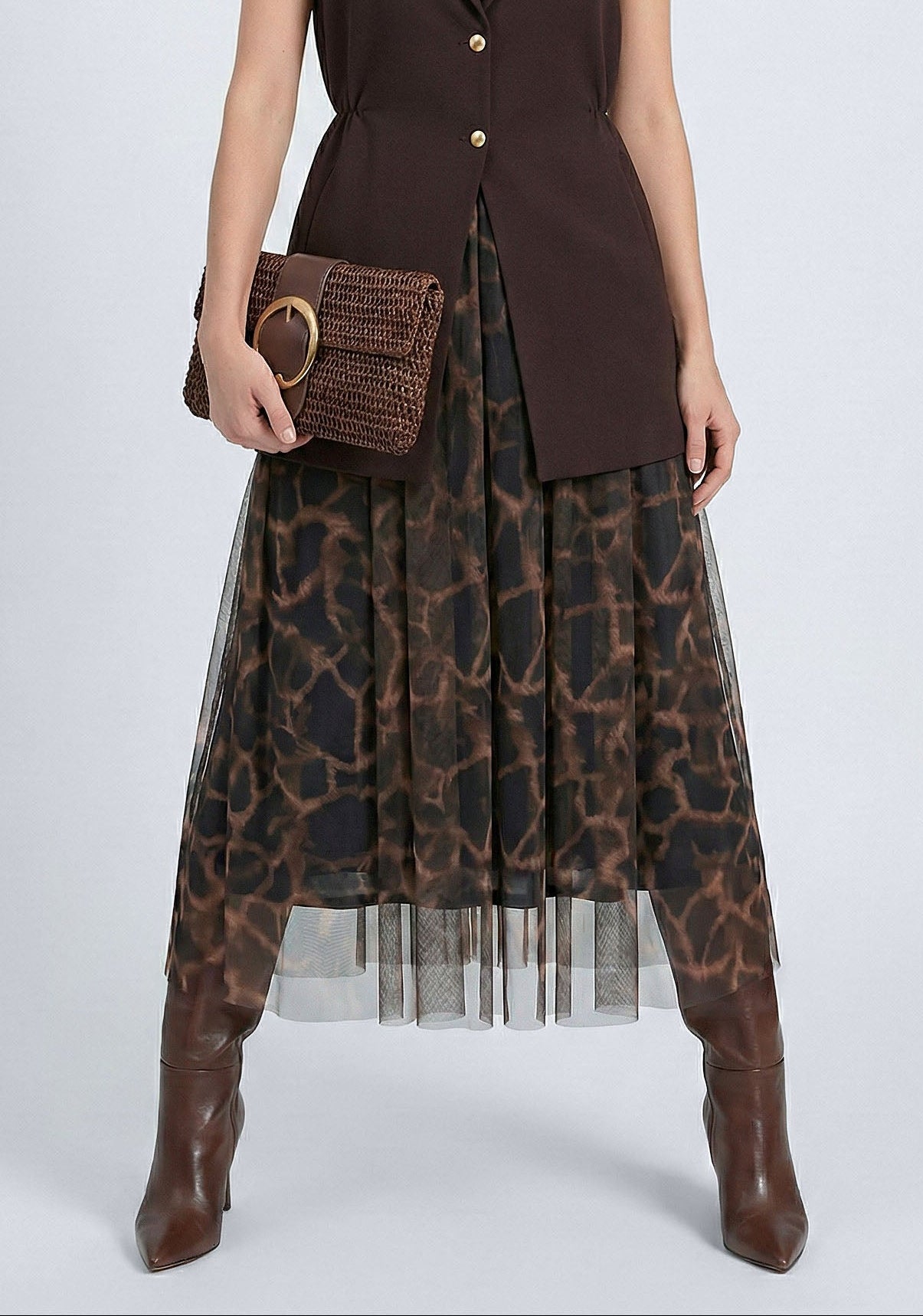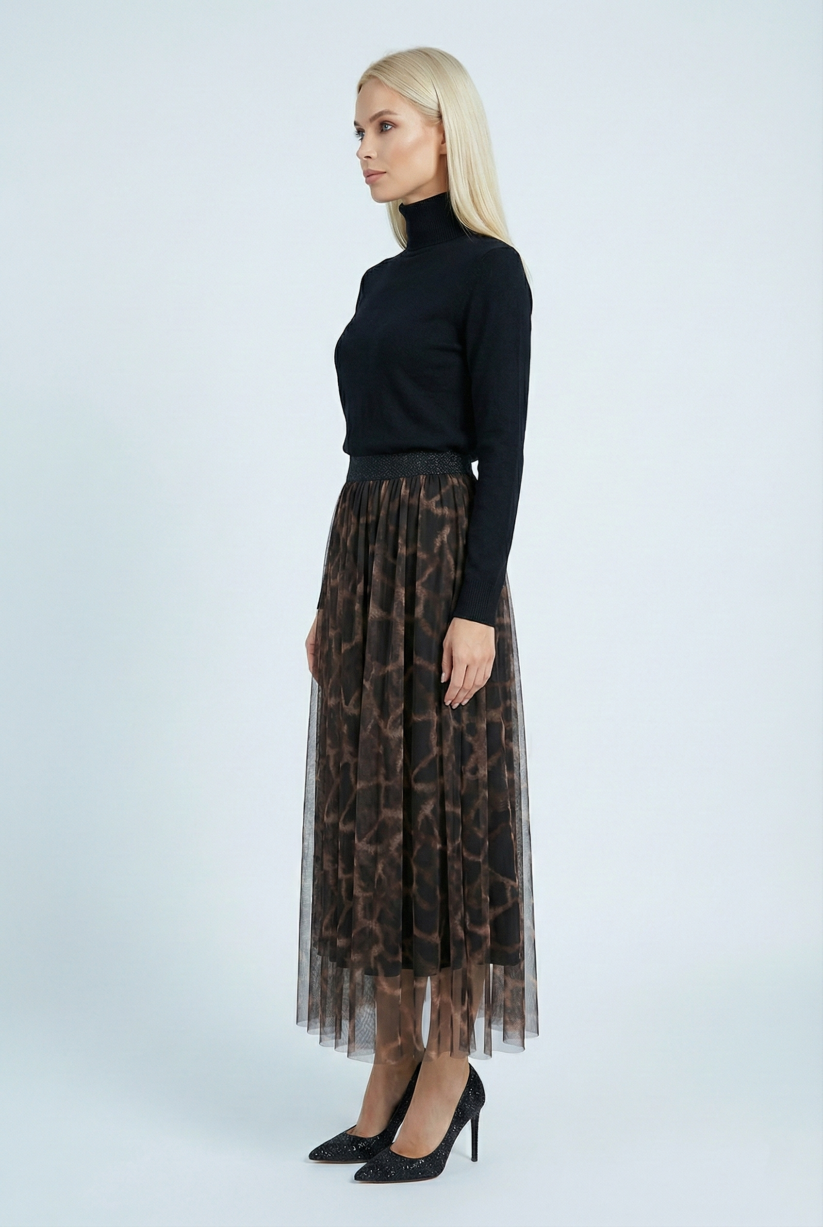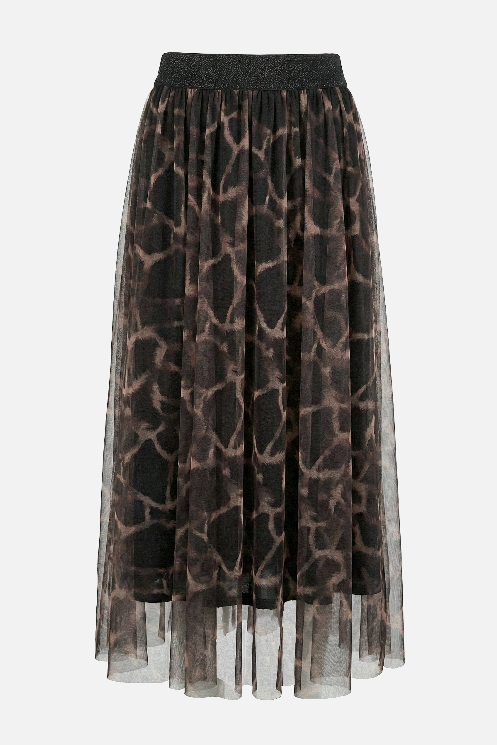 Gonna midi MERCI in tulle con delicata fantasia animalier, pensata per dare movimento e carattere a ogni look.