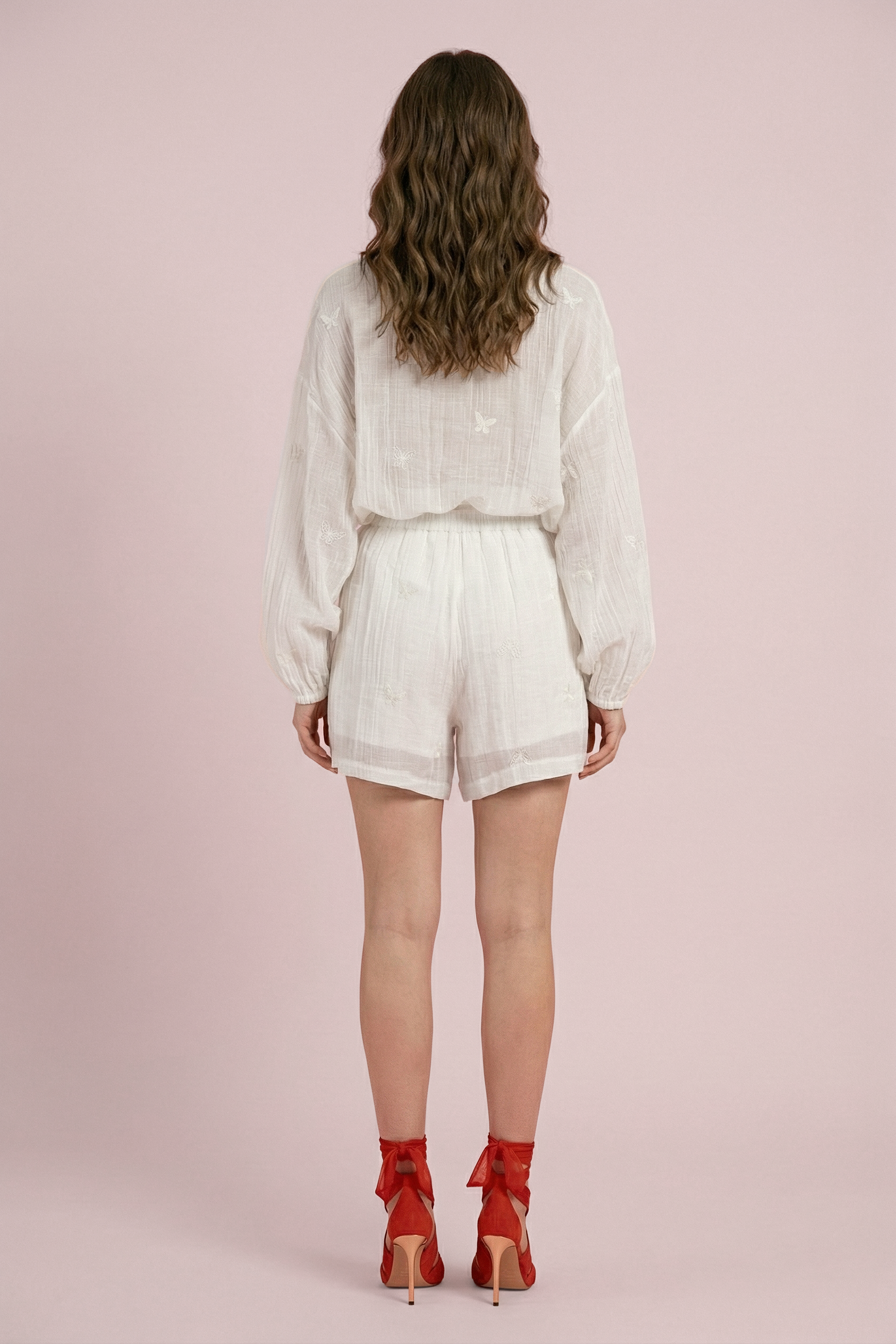 SIBILLE è un completo in tessuto leggero quasi impalpabile e semi-trasparente, pensato per le giornate più calde.Il completo è arioso e femminile, perfetto per look da giorno, vacanze o resort wear, da indossare insieme o separatamente per uno stile disinvolto ma curato.Gli shorts sono foderati ed elastici in vita.